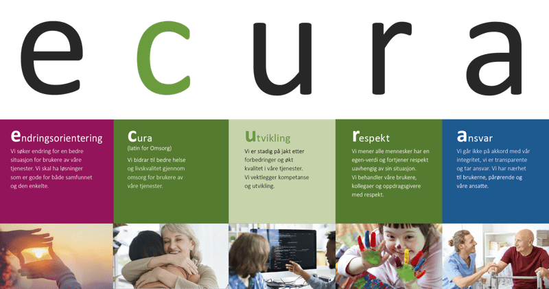 Ecura er en kompetansebedrift. Vi har en ambisjon om å utvikle oss til omsorgsbransjens mest attraktive arbeidsgiver gjennom å fokusere på fag, kompetanse, kvalitet og kultur. Ved bruk av kunnskaps- og/eller evidensbaserte tilnærminger vil vi fremstå med integritet og profesjonalitet i våre tjenester.